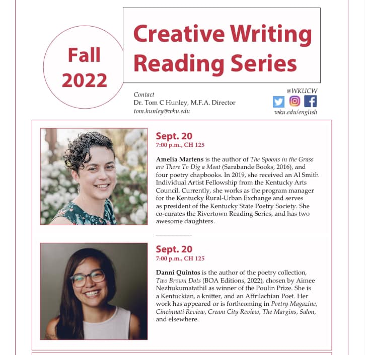 SEPTEMBER 20: Western Kentucky University Visiting Writers Series: Poets Danni Quintos and Amelia Martens. Cherry Hall, 7pm.